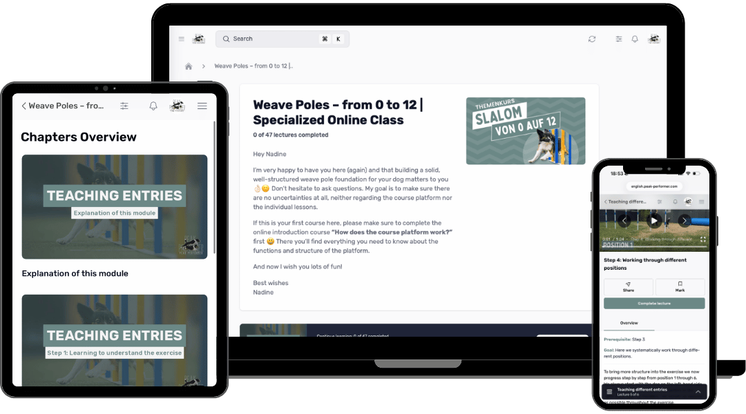 Working with (my own) dogs of various breeds and personalities, I share authentic and valuable content in more than 50 lessons supported by approximately one hour of video material and additional diagrams.