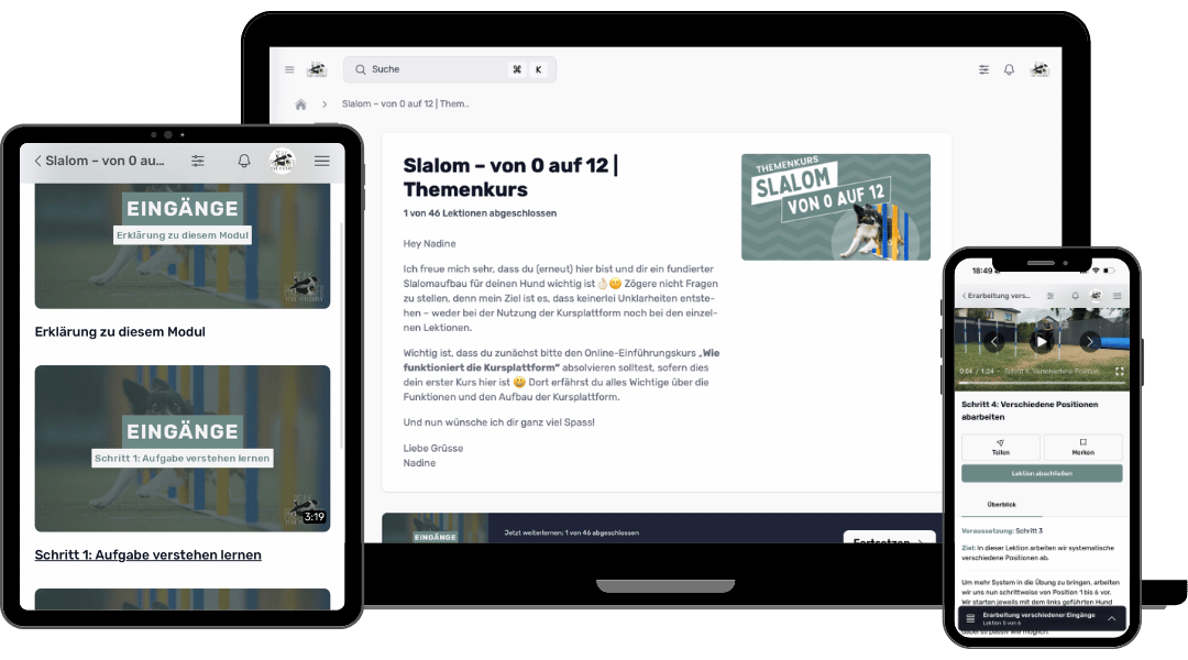 In diesem Online-Themenkurs steht der kleinschrittige und durchdachte Aufbau des Slaloms im Mittelpunkt – Schritt für Schritt und mit System. Der Kurs eignet sich einerseits für Hunde, die bislang noch keine Erfahrung mit dem Slalom haben, ebenso wie für Teams, bei denen ein strukturierter Neuaufbau aufgrund von Unsicherheiten oder Verständnisproblemen sinnvoll ist. Der Fokus liegt von Beginn an auf Unabhängigkeit, Tempo, zuverlässigen Ein- und Ausgängen sowie dem sicheren Unterscheiden von anderen Geräten.
